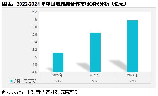 我国城市综合体的市场规模保持约10%的年均增长率,截止2024年底,我国城市综合体数量约为3800个左右,建筑面积约为5.2亿平方米,2024年的市场规模为5.98万亿元。