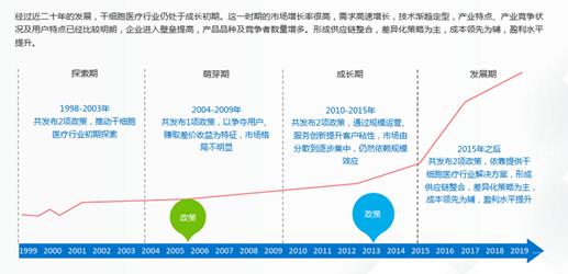 中国生物医药干细胞行业经历了四个发展阶段。1998~2003年处于探索期,政府发布两项政策,推动生物医药干细胞行业的初期探索。2004~2009年是萌芽期,这个阶段以争夺用户,赚取差价收益为特征,市场格局不明显。进入21世纪的第二个十年后,2010~2015年,生物医药干细胞行业迎来了成长期。通过规模运营,服务创新提升客户粘性,市场由分散到逐步集中,仍然依赖规模效应。2015年之后,生物医药干细胞行业进入了发展期。依靠提供于细胞医疗行业解决方案,形成供应链整合,差异化策略为主,成本领先为辅,盈利水平提升。