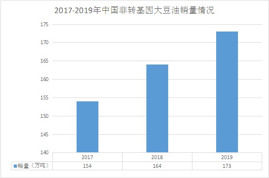 在销量方面,国内非转基因大豆油的销售情况良好,市场接受程度逐年提高。2019年,中国非转基因大豆油销量约为173万吨,较2018年上涨了5.49%。