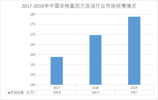 在国内非转基因大豆油市场中,由于进口大豆大多数属于转基因大豆,国内的非转基因大豆油的原材料主要来自国内的大豆种植,而国内的大豆对于进口的依赖程度较高,导致国内非转基因大豆油只占较小的比重。2019年,国内非转基因大豆油市场规模约为178.7亿元,较2018年上涨了5.3%。
