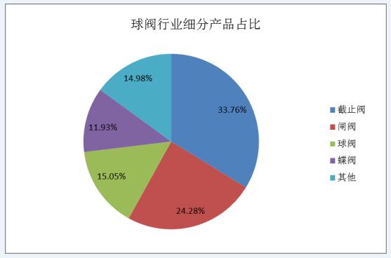 根据应用领域和地区等因素,球阀市场可以细分为多个子市场。例如,按产品类型可分为浮动球球阀、固定球球阀、V型球阀等;按应用领域可分为石油天然气、化工、电力、水处理等。不同应用领域的球阀需求有所不同。例如,石油天然气行业对高压、高温、耐腐蚀的球阀需求较大;而化工行业则更注重球阀的密封性能和耐腐蚀性。根据阀的产品类型,阀主要分为截止阀、闸阀、球阀、蝶阀等,其中截止阀产品市场占比33.76%,闸阀产品市场占比24.28%,球阀产品市场占比15.05%,蝶阀产品市场占比11.93%,其他阀产品市场占比14.98%。