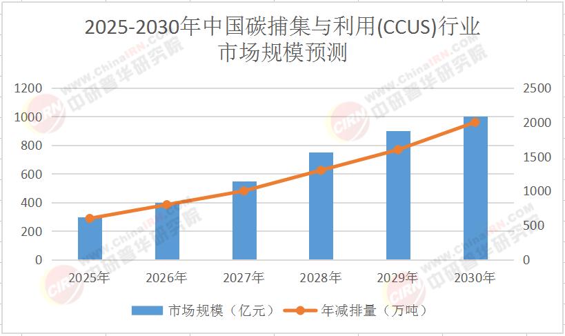 根据中研普华产业研究院《2025-2030年中国碳捕集与利用(CCUS)行业全景研究及趋势洞察报告》预测,2025年中国CCUS市场规模预计将突破300亿元,年减排量超600万吨,较2020年增长5倍。展望未来,到2030年,中国CCUS市场规模有望冲击1000亿元,形成覆盖超10亿吨/年减排能力、支撑千亿级市场的CCUS生态。以下是一个简化的市场规模预测表格,展示了未来几年中国CCUS市场的增长趋势: