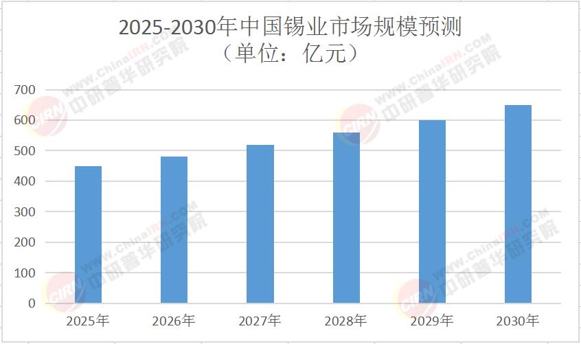 根据中研普华产业研究院《2025-2030年中国锡业深度调研与发展预测研究报告》预测,到2030年,中国锡业市场规模将持续扩大,结构将进一步优化。新兴领域用锡需求的增长将推动锡业向高端化、智能化方向发展;同时,再生锡回收体系的完善也将为锡业提供新的增长点。以下为预测的2025-2030年中国锡业市场规模(单位:亿元):