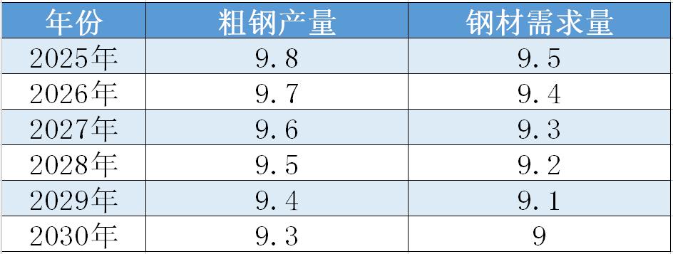 表1 2025 - 2030年中国钢铁产业市场规模预测(单位:亿吨)