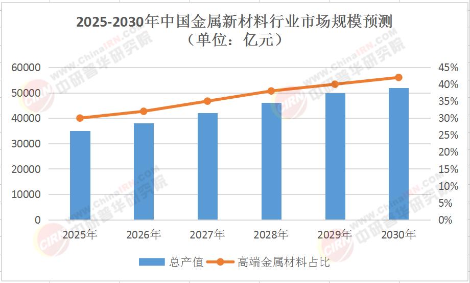 根据中研普华产业研究院《2025-2030年中国金属新材料行业深度分析与发展趋势预测报告》预测,到2030年,中国金属新材料行业总产值将突破5万亿元,其中高端金属材料占比将超40%。再生金属制品市场规模也将达到近千亿元。从细分领域来看,汽车轻量化用铝/镁合金、航空航天用钛合金、半导体用高纯金属等将成为增长最快的领域。同时,绿色化、智能化、全球化将成为未来发展的核心驱动力。