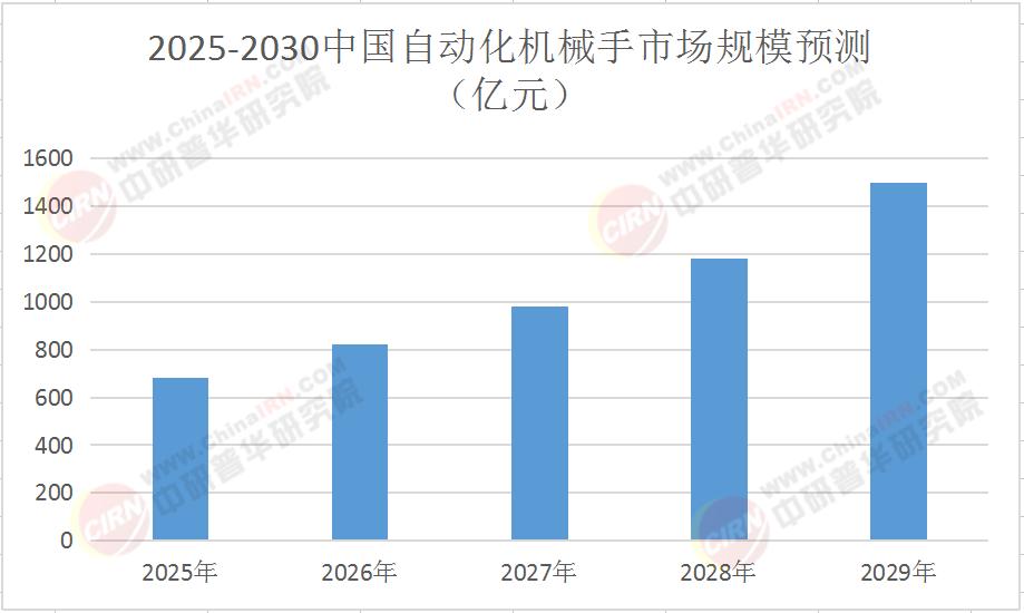 根据中研普华产业研究院发布的《2025-2030年自动化机械手行业市场深度分析及发展规划咨询综合研究报告》显示,2025年中国自动化机械手市场规模达680亿元,至2030年将以15%-18%的CAGR扩张至1500亿元量级。这种指数级增长背后,是三大结构性力量的共振:制造业劳动力成本年均上升8%、工业机器人密度较2022年提升60%、新能源汽车/半导体等新兴领域贡献30%以上增量需求。