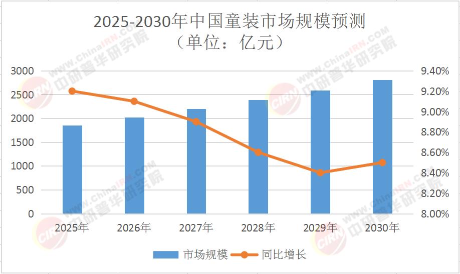 2025-2030年中国童装市场规模预测(单位:亿元)