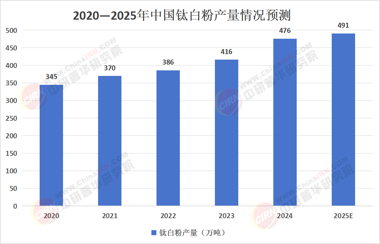 据中研普华产业研究院的《2025-2030年钛白粉市场发展现状调查及供需格局分析预测报告》分析,2020—2025年中国钛白粉产量处于稳步上升通道。2020年产量为345万吨,此后逐年递增,到2025年预计将达到491万吨。这一增长趋势反映了市场对钛白粉需求的不断增加。随着国内经济的持续发展,建筑、汽车、家电等行业对涂料、塑料等产品的需求旺盛,而钛白粉作为这些产品的重要原料,其市场需求也随之水涨船高。例如,建筑行业的蓬勃发展带动了涂料市场的增长,涂料企业对钛白粉的需求大幅增加,推动了钛白粉产量的提升。