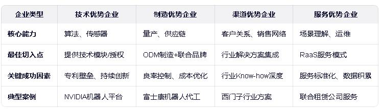 垂直整合能力企业:具备硬件-软件-数据闭环能力的企业将获得估值溢价,如能同时提供机器人本体、场景算法和运维平台的企业,预期IRR可提升8-12个百分点。