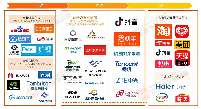 中国AI电商产业链中游包括解决方案提供商,这些企业利用上游提供的AI技术,为电商平台和零售商提供具体的解决方案,包括推荐引擎、智能客服、供应链优化和为电商平台提供大数据分析、处理和管理服务,协助中小型电商获取和分析大量的用户数据。