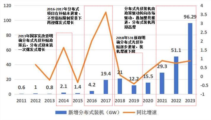图:2011-2023年中国分布式光伏新增装机量及同比增速