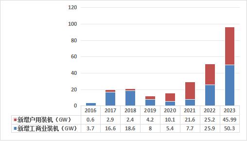 图:2016-2023年中国户用和工商业用分布式光伏新增装机量