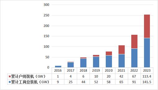 图:2016-2023年中国户用和工商业用分布式光伏累计装机量