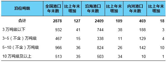 根据《交通运输行业发展统计公报》,截至2023年底,中国港口拥有生产用码头泊位22023个,比上年末增加700个。其中万吨级及以上泊位2878个,比上年末增加127个。年末全国万吨级及以上泊位中,专业化泊位1544个,比上年末增加76个;通用散货泊位664个,增加27个;通用件杂货泊位447个,增加13个。