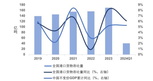 港口行业服务于腹地货物上下水需求,行业发展成熟,吞吐量与吞吐量与GDP整体整体同步增长。2023年,全国港口实现货物吞吐量169.73亿吨,同比增长8.2%。其中,内河港口完成61.39亿吨,同比增长10.5%,沿海港口完成108.35亿吨,增长6.9%;外贸货物吞吐量50.47亿吨,同比增长9.5%,内贸货物吞吐量119.26亿吨,同比增长7.7%。