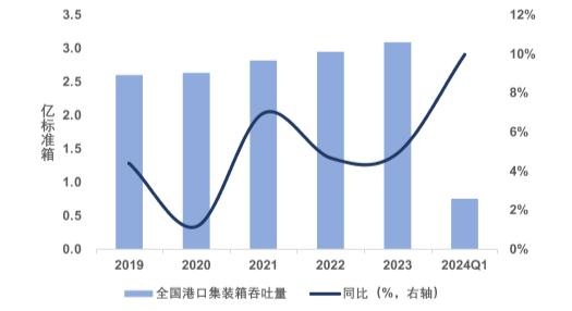 集装箱吞吐量方面,近年来多式联运的推广带动“散改集”需求旺盛,全国主要港口集装箱吞吐量持续增长。2023年,全国港口完成集装箱吞吐量3.10亿标准箱,同比增长4.9%;其中,集装箱铁水联运量完成1018万标准箱,增长15.9%。2024年第一季度,全国港口实现货物吞吐量40.89亿吨,同比增长6.1%;全国港口实现集装箱吞吐量0.77亿标准箱,同比增长10.0%。