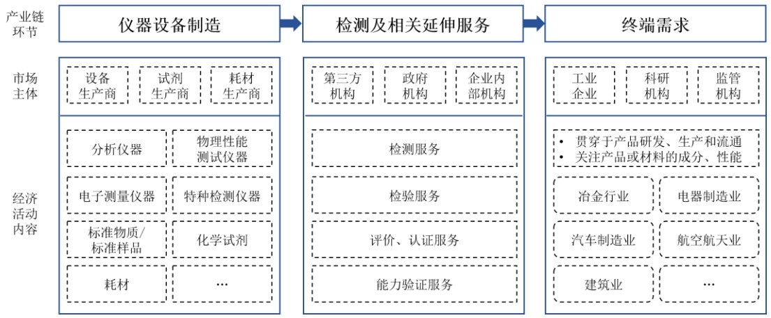 检验检测服务贯穿国民经济各行业。检测服务产业链上游主要是检测仪器设备的制造,中游是检测及相关延伸服务,下游则涉及建筑建材、电子电器、医药医学、环境、食品、纺织服装等国民经济各个行业。