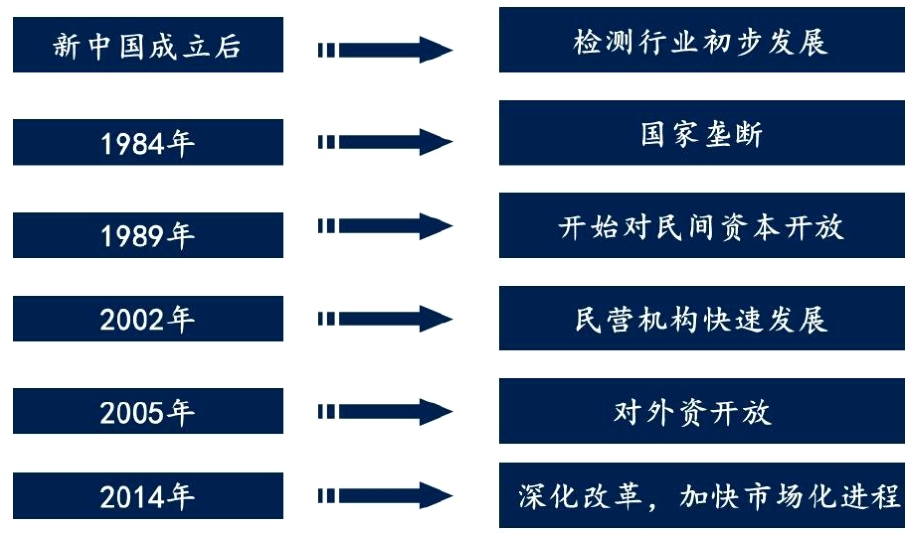 检测行业发展历史是市场化水平不断提高的过程。按照行业内活动主体的不同,国内第三方检测行业发展历程可划分为国家垄断、逐步放开和持续市场化三个阶段。