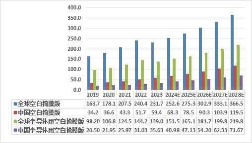 图:2019-2028年全球及中国空白掩膜版行业市场规模情况(单位:亿元)