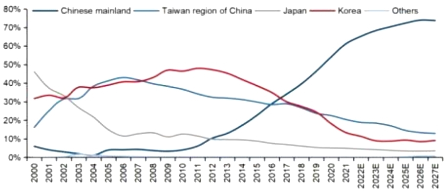 随着韩国三星、LG逐步关停或出售所拥有的TFTLCD生产线,中国大陆在全球TFTLCD市场的占比进一步提升。根据Omdia预测,到2027年中国大陆LCD产能在全球的占比(按面积)将达到73.74%,占据绝对领先地位。