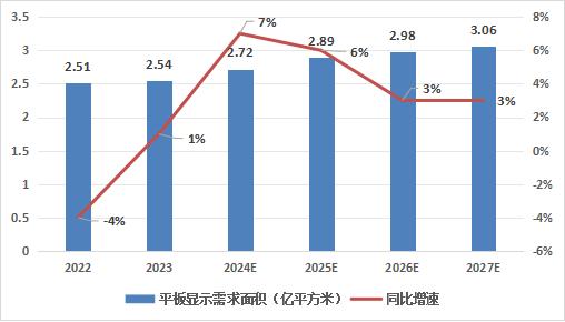 平板显示行业长期发展呈现像素高精度化、尺寸大型化、竞争白热化、转移加速化、产品定制化等特点。受益于电视平均尺寸增加,大屏手机、车载显示和公共显示等需求的拉动,根据Omdia 2023年9月预测,2027年全球平板显示需求超过3亿平方米。