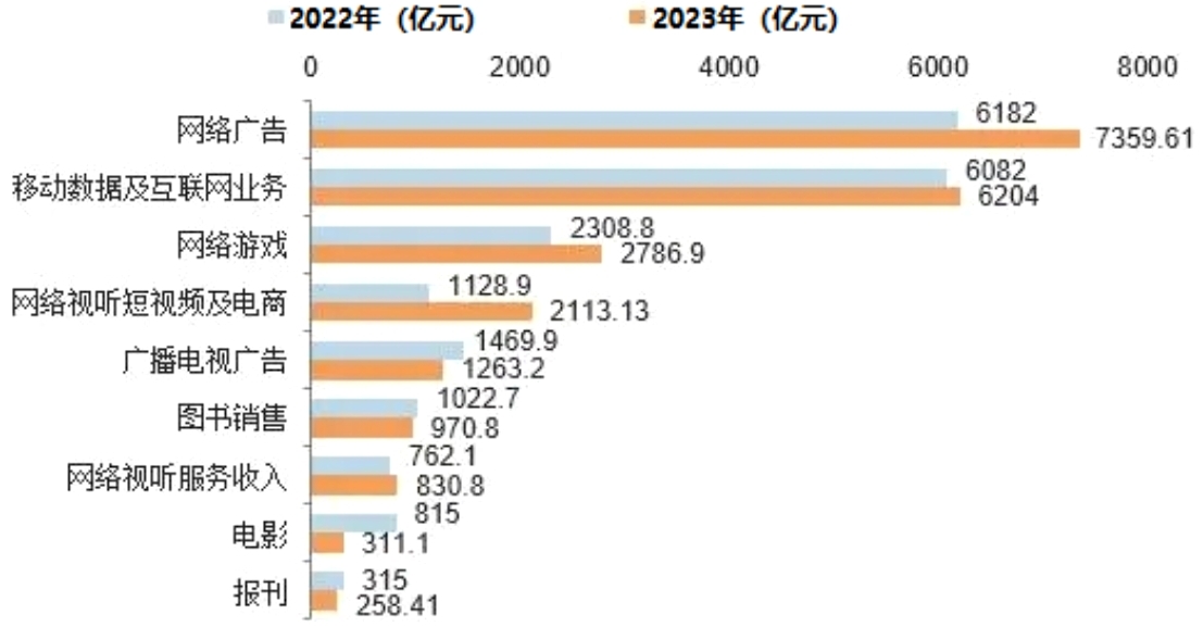 图:2022-2023年中国影视传媒产业主要细分市场收入情况