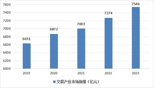 近年来,中国大文娱产业市场规模呈现稳步上升趋势。以影视、音乐、游戏、动漫等核心领域为例,影视行业票房收入和网络视频平台会员付费收入不断攀升,音乐产业数字音乐付费市场逐步扩大,游戏产业凭借国内庞大的用户基础和海外市场拓展,整体营收持续增长,动漫产业在原创内容崛起和IP商业化运营的推动下,市场规模也实现了显著扩张,带动整个大文娱产业规模屡创新高。根据调研数据显示,2019-2023年期间,中国文娱产业市场规模呈现出持续增长态势,截至2023年底,市场规模增长至为7546亿元。