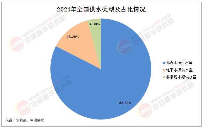 水利部发布的2024年《中国水资源公报》显示,2024年全国供水总量为5928.0亿立方米。其中,地表水源供水量为4892.4亿立方米,占供水总量的82.5%;地下水源供水量为784.0亿立方米,占供水总量的13.2%;非常规水源供水量为251.6亿立方米,占供水总量的4.3%。