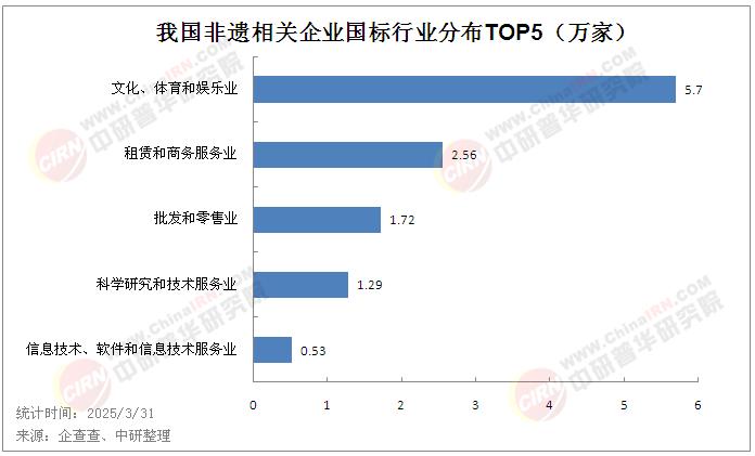企查查数据显示,行业分布上,我国非遗相关企业主要归属文化、体育和娱乐业,有5.70万家,占比40.0%;其次是归属租赁和商务服务业的企业,有2.56万家,占比18.0%;归属批发和零售业的企业有1.72万家,占比12.1%。