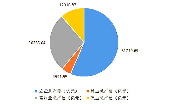 2017年中国农林牧渔总产值为114696.2亿元,其中农业总产值为61719.69亿元,同比增长2431.91亿元,占比53.82%。